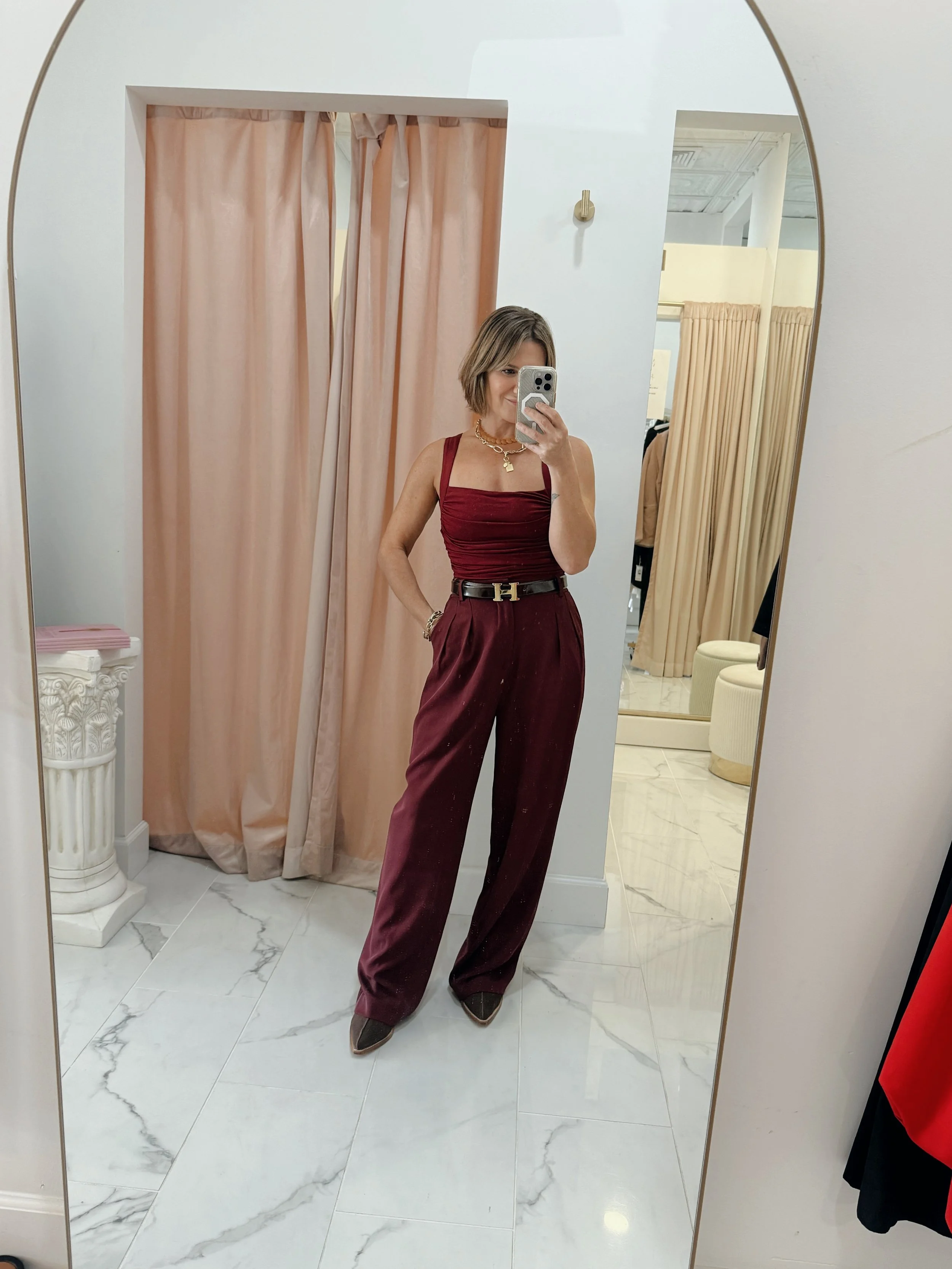 I think it’s hilarious when a color is a trend. Call it cabernet, merlot, garnet or just deep red - burgundy is the anchor color of the Autumn 2025. From sleek trousers to silk camisoles, burgundy pairs beautifully with neutrals, denim, and other autumn tones.