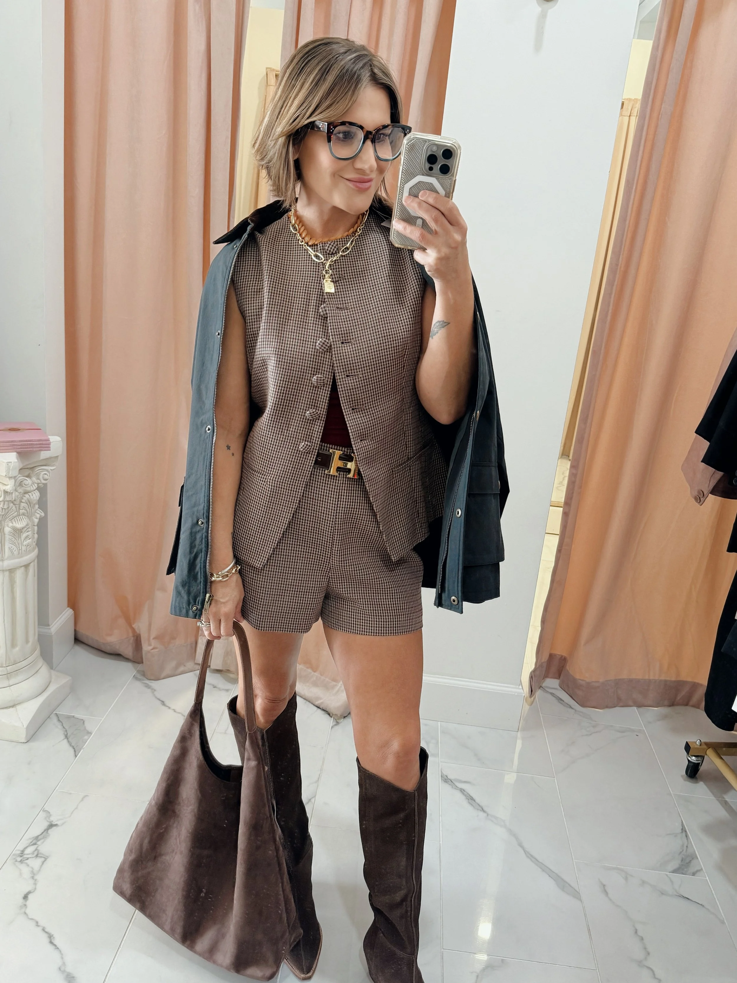 Check, please! Houndstooth, glen plaid, or tiny tailored checks—brown is the neutral of the season. Whether it’s in a matching vest-and-short set or a vintage blazer, brown checks add structure and polish without feeling fussy.