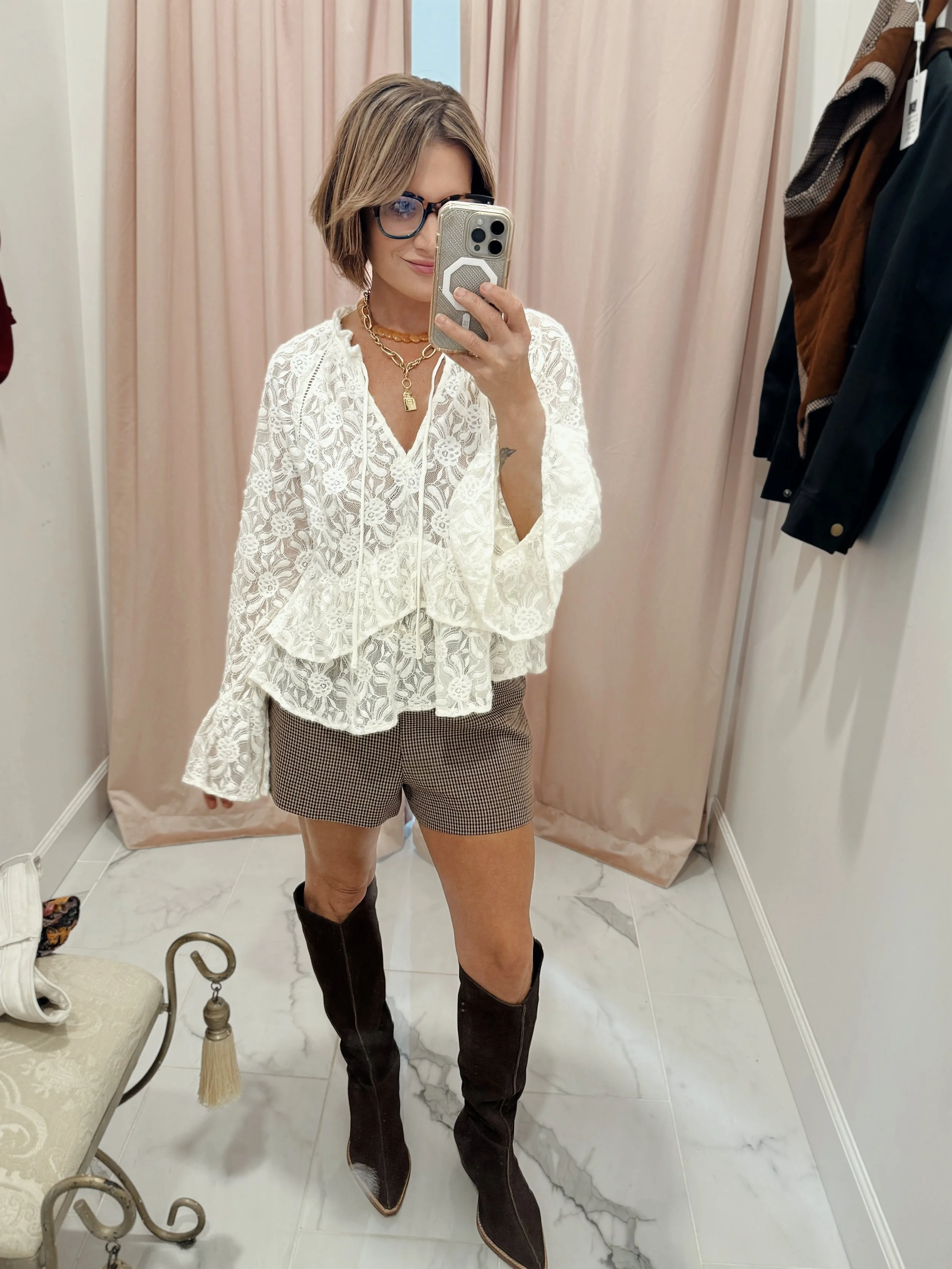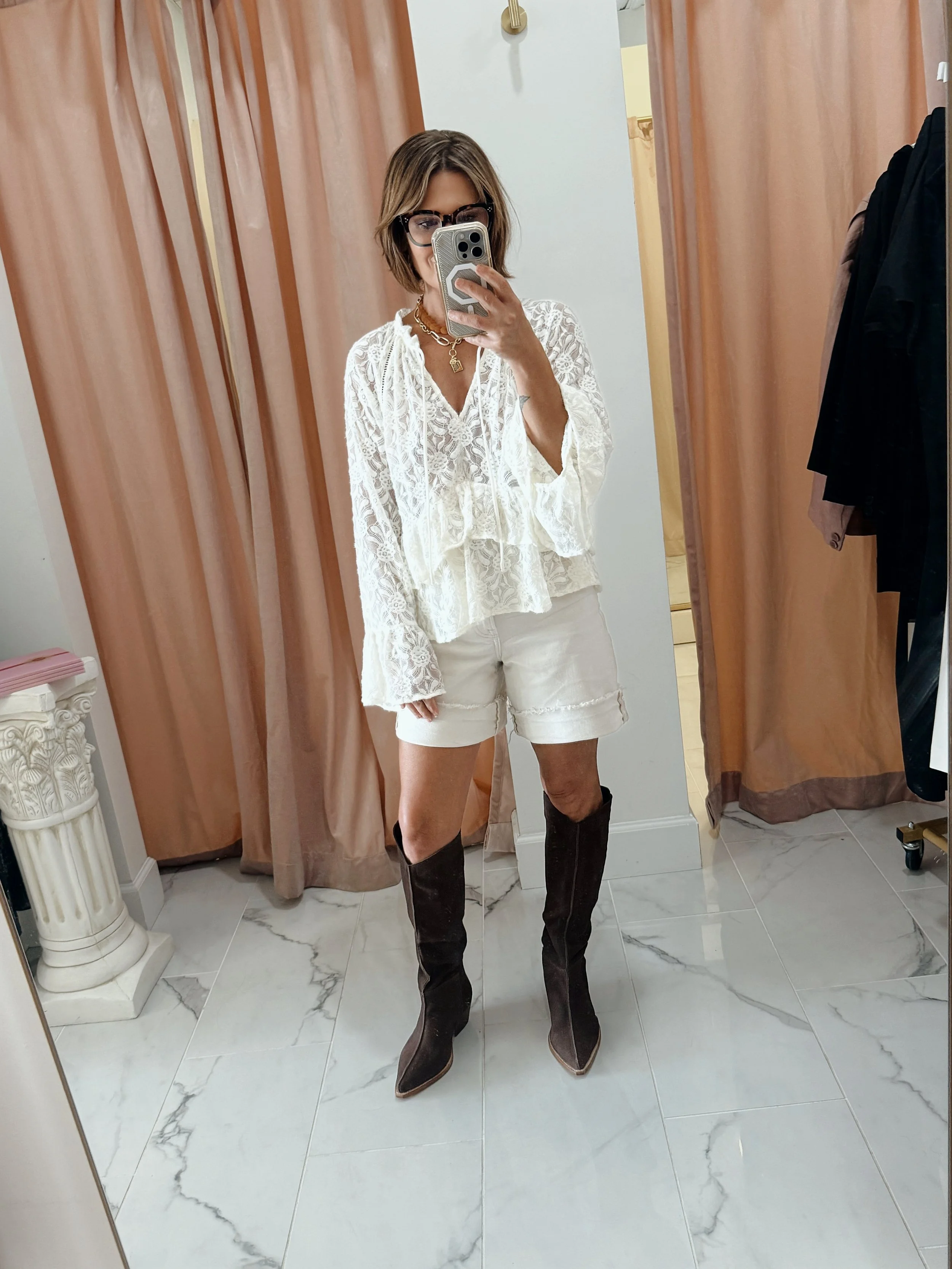 This beauty is ASTR the Label Tiered Lace Bell Sleeve Top in Buttercream.